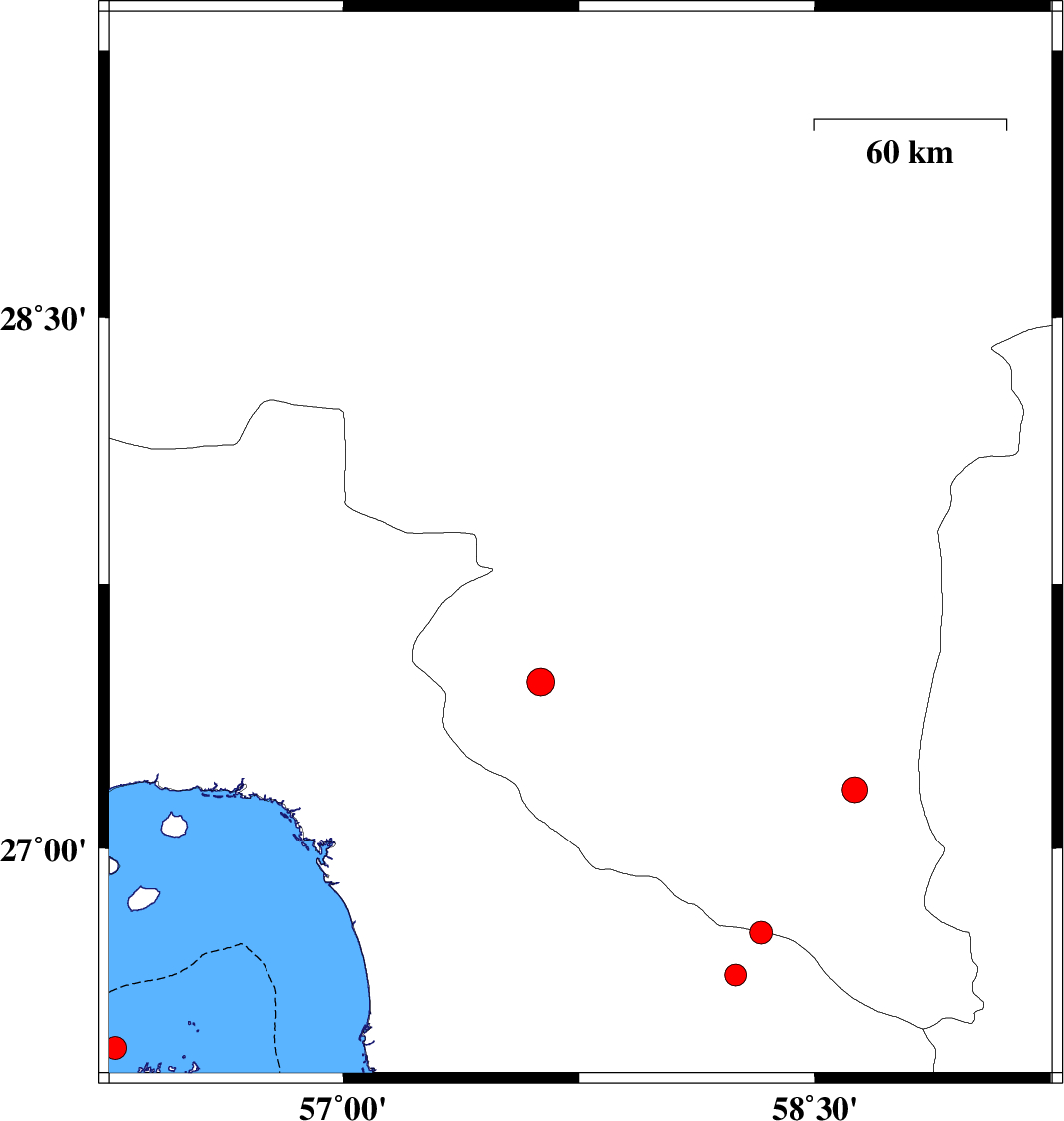 | 2022/01/11 | 01:58:06.2 | 05:28:06.2 | 27.859 | 57.754 | 12 | ML:3.2 | Kerman Province, 12 km of Kahnuj | ||