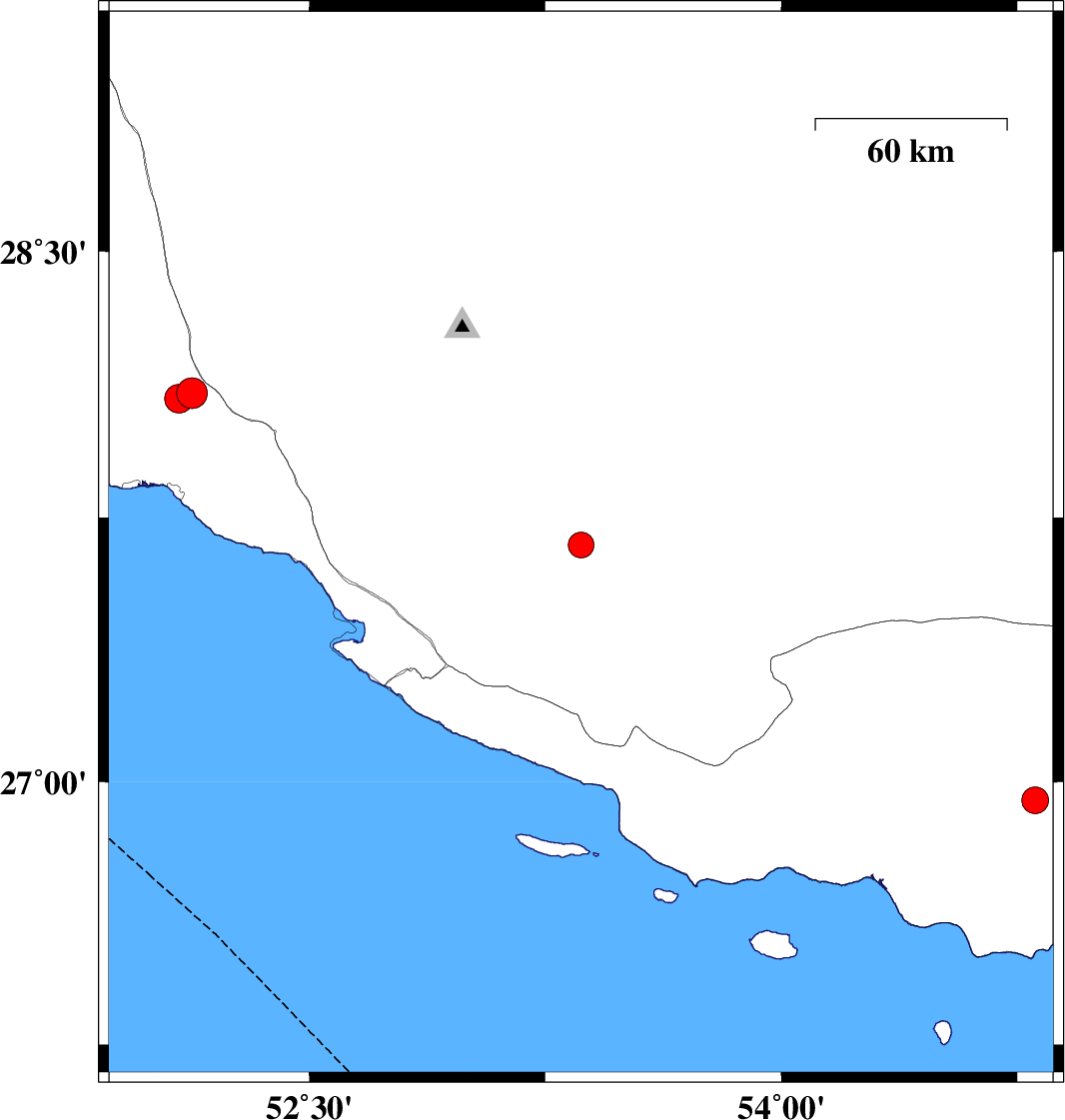 2022/01/30 | 23:56:37.3 | 03:26:37.3 | 27.672 | 53.364 | 12 | ML:3.6 | Fars Province, 42 km North-East of Lamerd | ||