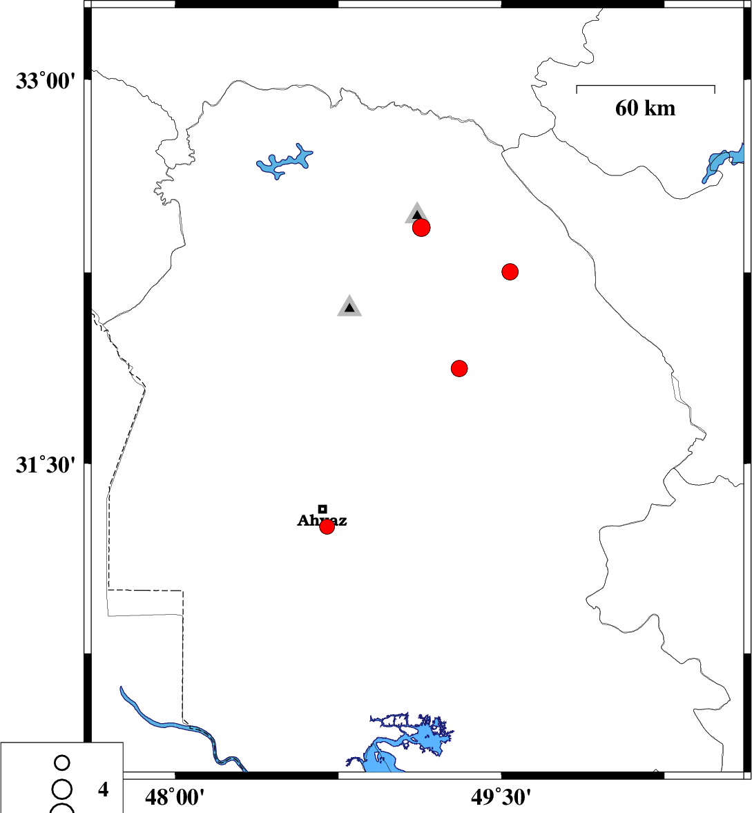 | 2022/01/24 | 01:14:53.8 | 04:44:53.8 | 32.397 | 49.722 | 12 | ML:3.4 | Khoozestan Province, 38 km -West of Chelgard |
