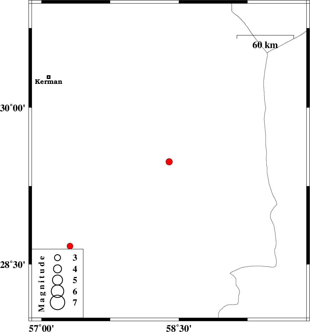 | 2022/04/08 | 06:28:51.9 | 10:58:51.9 | 29.483 | 58.394 | 12 | ML:3.2 | Kerman Province, 42 km North of Bam | ||