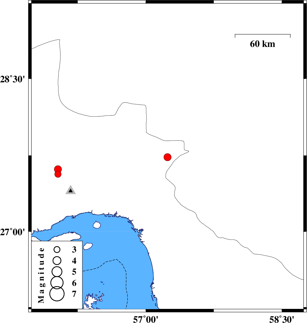 | 2022/04/27 | 19:30:12.2 | 00:00:12.2 | 27.732 | 57.24 | 14 | ML:3.7 | Hormozgan Province, 34 km North of Dehbarez | ||