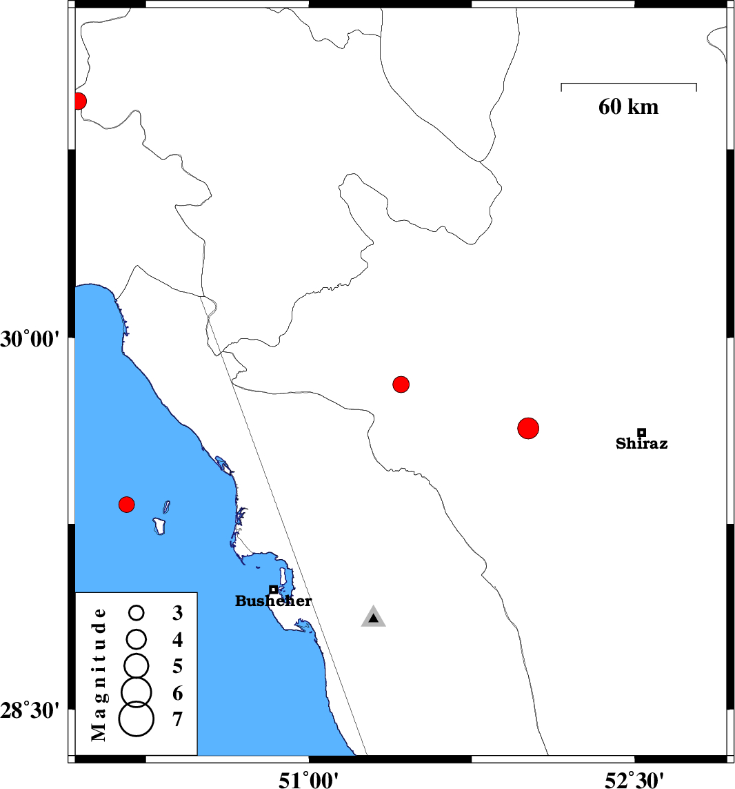 | 2022/04/11 | 08:43:44.6 | 13:13:44.6 | 29.328 | 50.16 | 9 | ML:3.3 | Persian Gulf, 44 km South-West of Bandar-e genaveh |