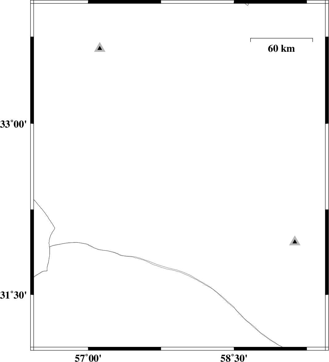 | 2022/04/25 | 17:41:59.8 | 22:11:59.8 | 31.068 | 57.365 | 12 | ML:3.1 | Kerman Province, 57 km South-East of Ravar | ||