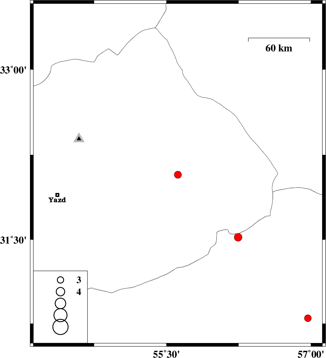 | 2022/05/04 | 08:21:15.2 | 12:51:15.2 | 32.074 | 55.619 | 8 | ML:3.4 | Yazd Province, 56 km North-East of Bafq | ||