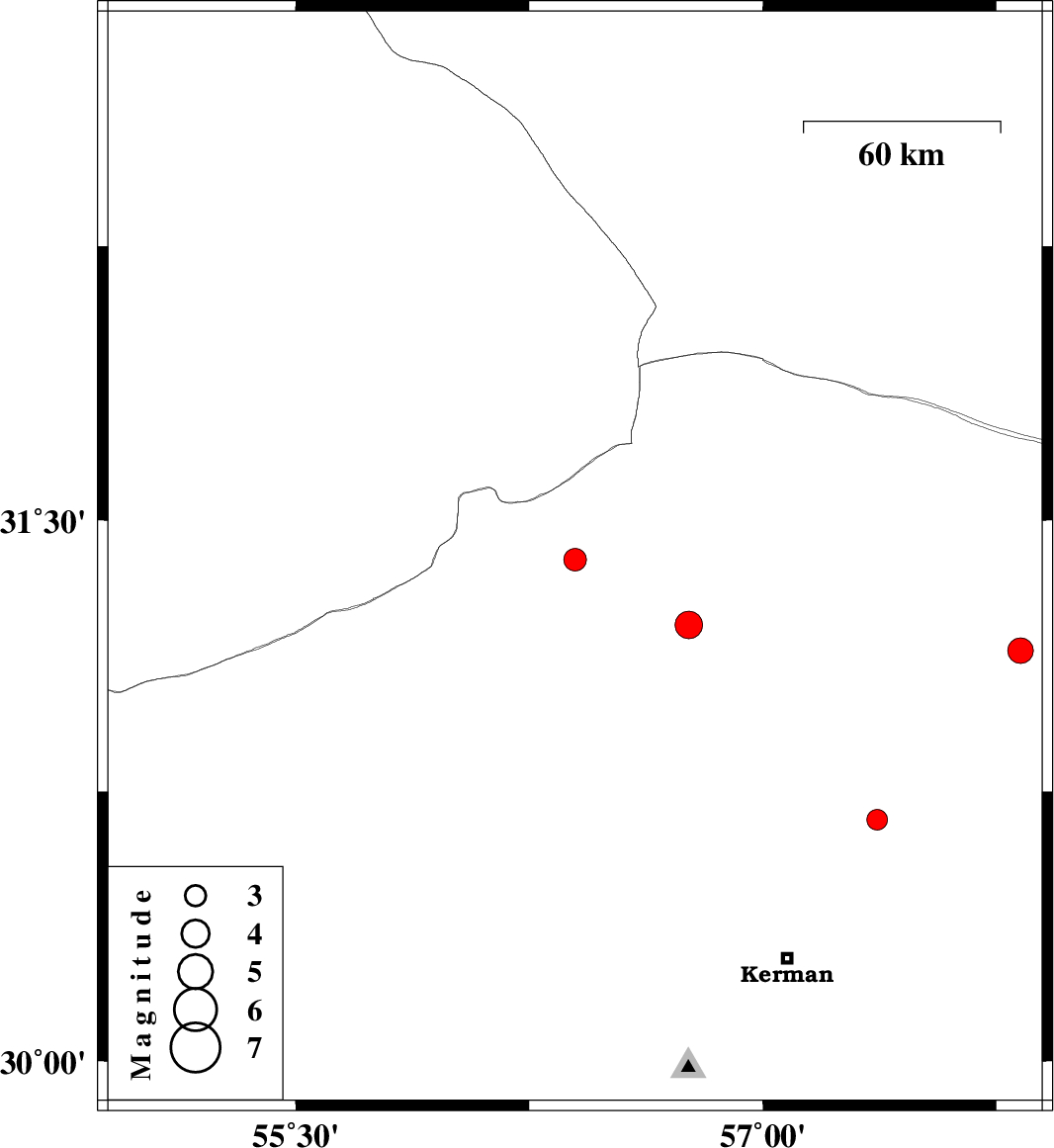 | 2022/06/14 | 22:38:43.2 | 03:08:43.2 | 30.672 | 57.367 | 9 | ML:2.9 | Kerman Province, 51 km North-East of Kerman | ||