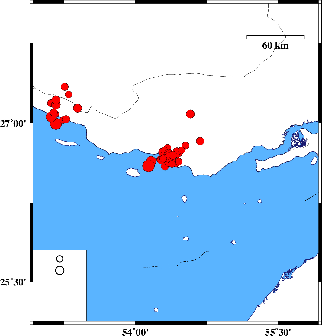 2022/06/18 16:44:47.5 21:14:47.5 26.64254.16612 ML:4.7 Persian Gulf, 65 km South-West of Bastak