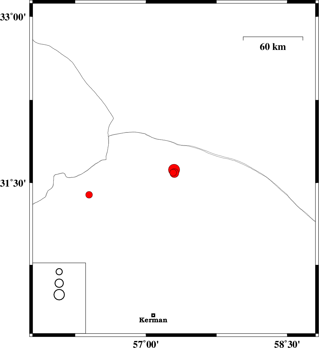 | 2022/06/26 | 15:39:00.2 | 20:09:00.2 | 31.588 | 57.303 | 12 | ML:4.3 | Kerman Province, 59 km North-East of Ravar | ||