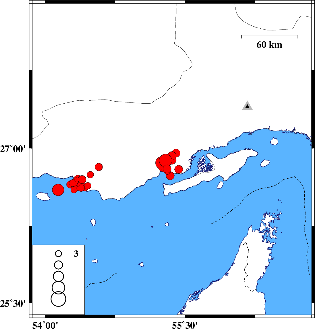 2022/06/24 23:47:23.3 04:17:23.3 26.65154.2712 ML:3.7 Persian Gulf, 62 km South of Bastak