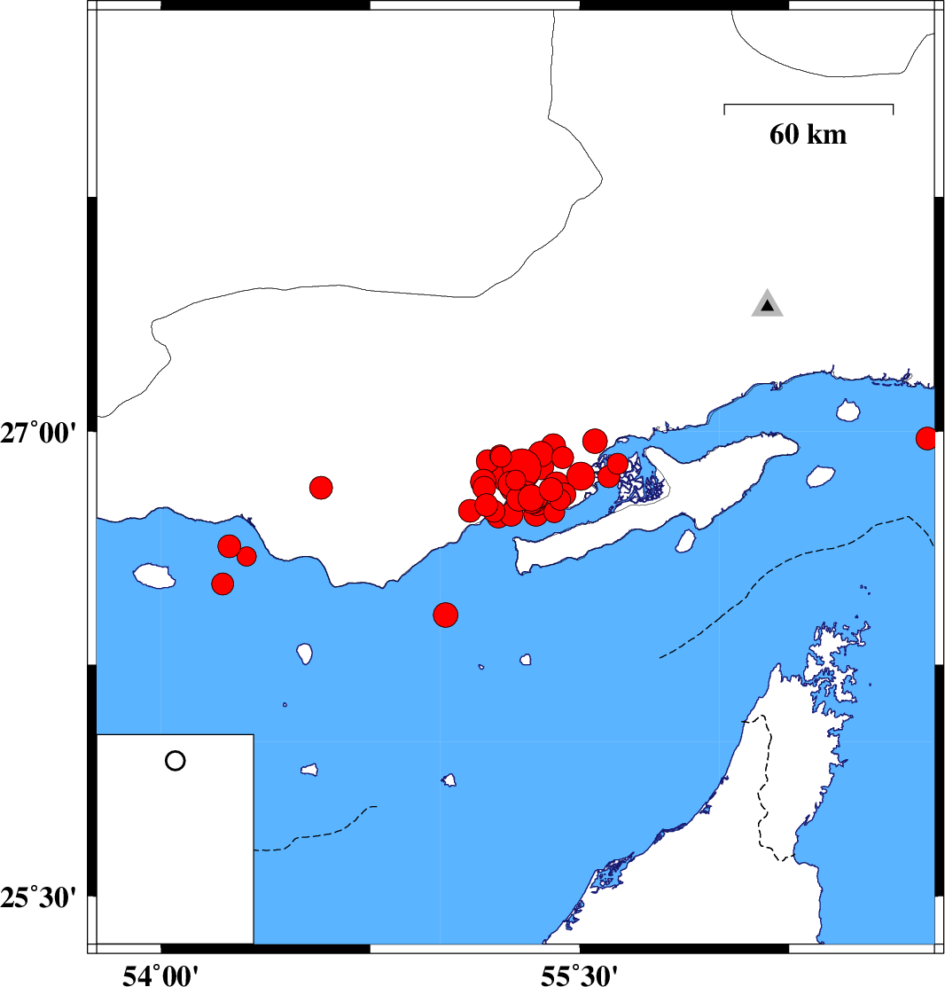 2022/07/03 12:18:59.5 16:48:59.5 26.63154.2459 ML:3.7 Persian Gulf, 64 km South-West of Bastak