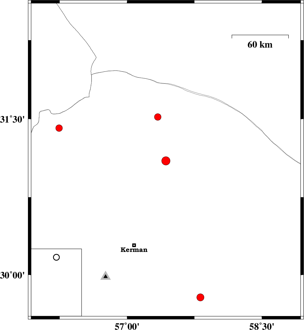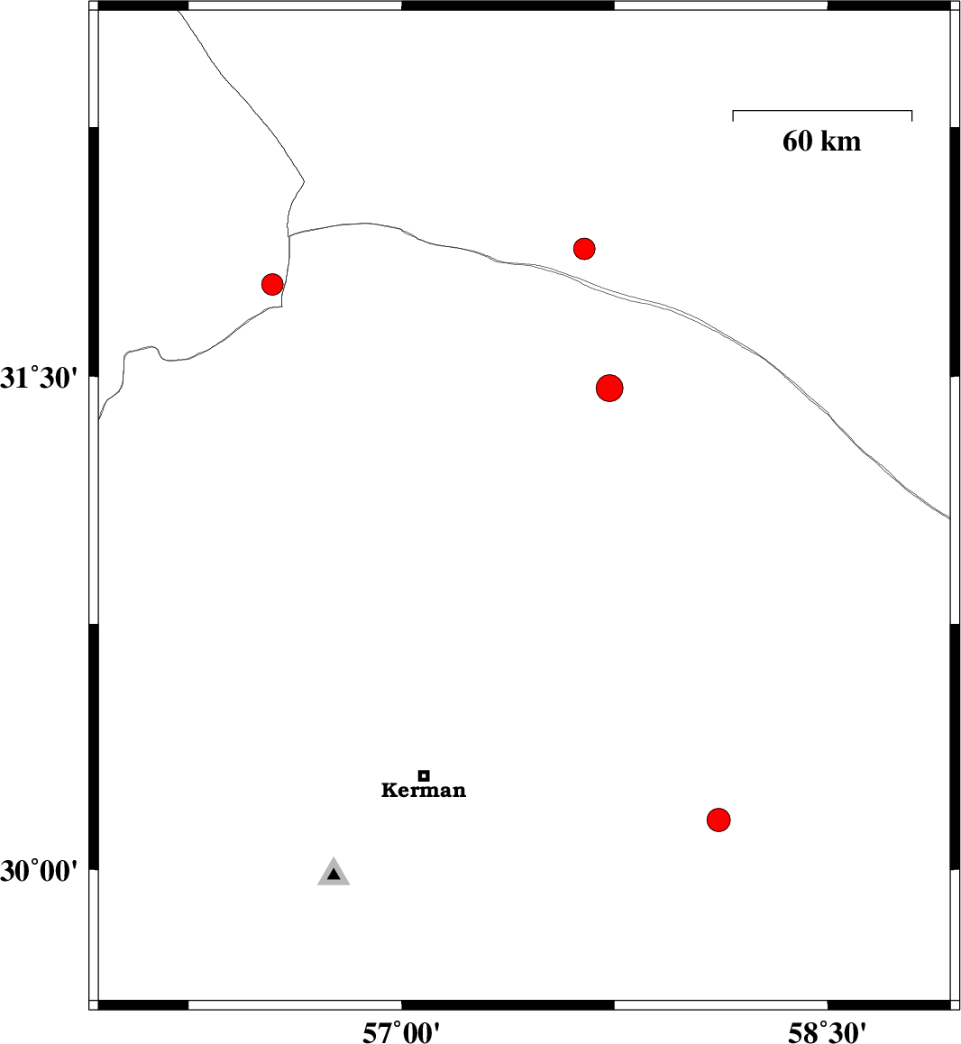 | 2022/08/15 | 03:31:58.5 | 08:01:58.5 | 31.099 | 57.432 | 12 | ML:4.2 | Kerman Province, 62 km South-East of Ravar | ||
