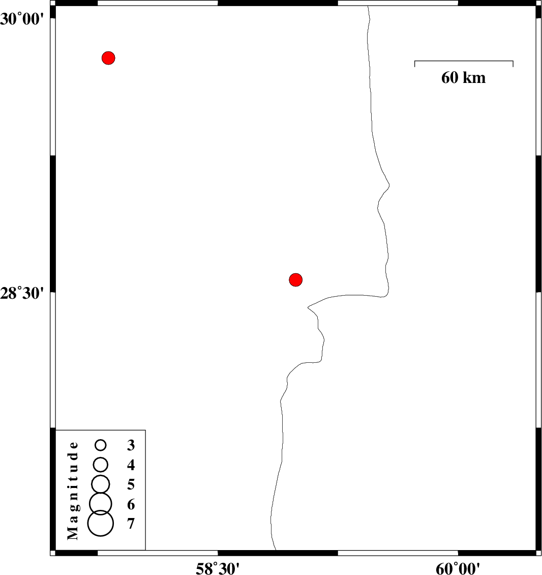 | 2022/08/19 | 04:02:15.2 | 08:32:15.2 | 28.567 | 58.986 | 12 | ML:3.7 | Kerman Province, 86 km South-East of Bam | ||