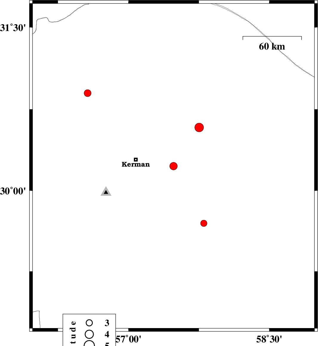 | 2022/08/15 | 03:31:58.5 | 08:01:58.5 | 31.099 | 57.432 | 12 | ML:4.2 | Kerman Province, 62 km South-East of Ravar | ||