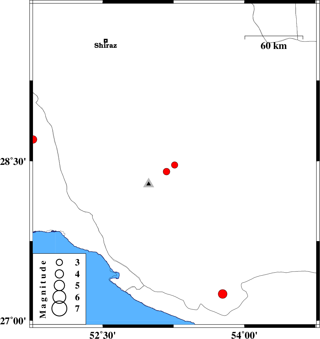 | 2022/08/27 | 15:47:15.0 | 20:17:15.0 | 28.702 | 51.764 | 12 | ML:3.6 | Bushehr Province, 39 km -East of Khormog | ||