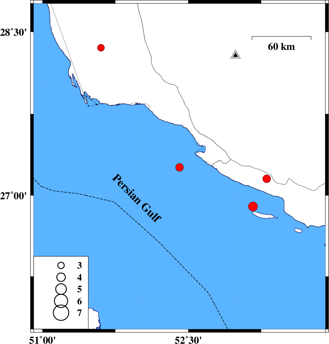 | 2022/07/26 | 21:40:01.8 | 02:10:01.8 | 27.259 | 52.41 | 12 | ML:3.7 | Persian Gulf, 64 km South of Jam | ||