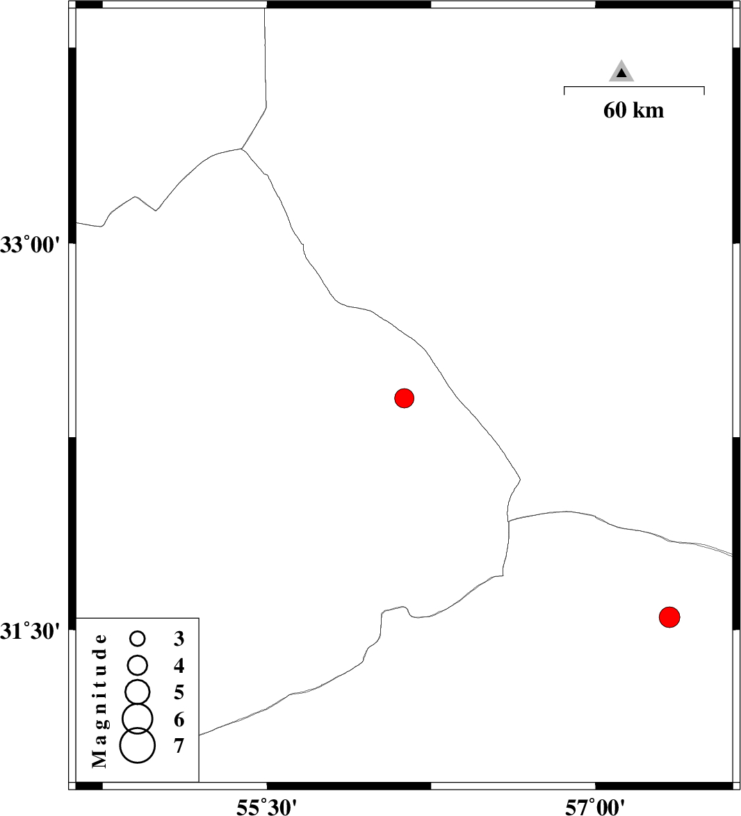 | 2022/09/25 | 06:10:19.8 | 09:40:19.8 | 31.549 | 57.338 | 20 | ML:4.3 | Kerman Province, 59 km North-East of Ravar |