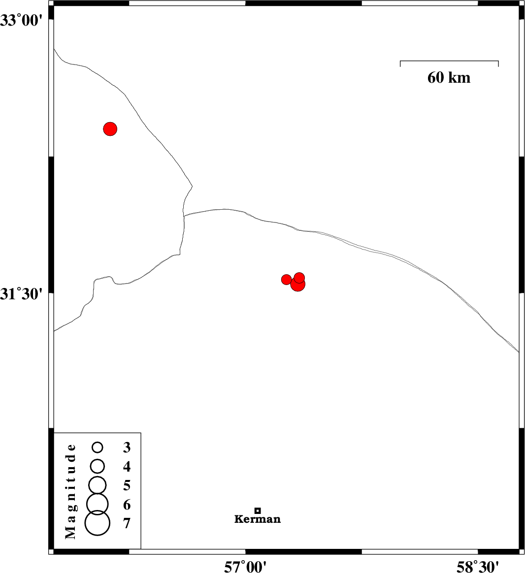 | 2022/09/28 | 02:41:49.9 | 06:11:49.9 | 31.582 | 57.346 | 12 | ML:3.1 | Kerman Province, 62 km North-East of Ravar | ||