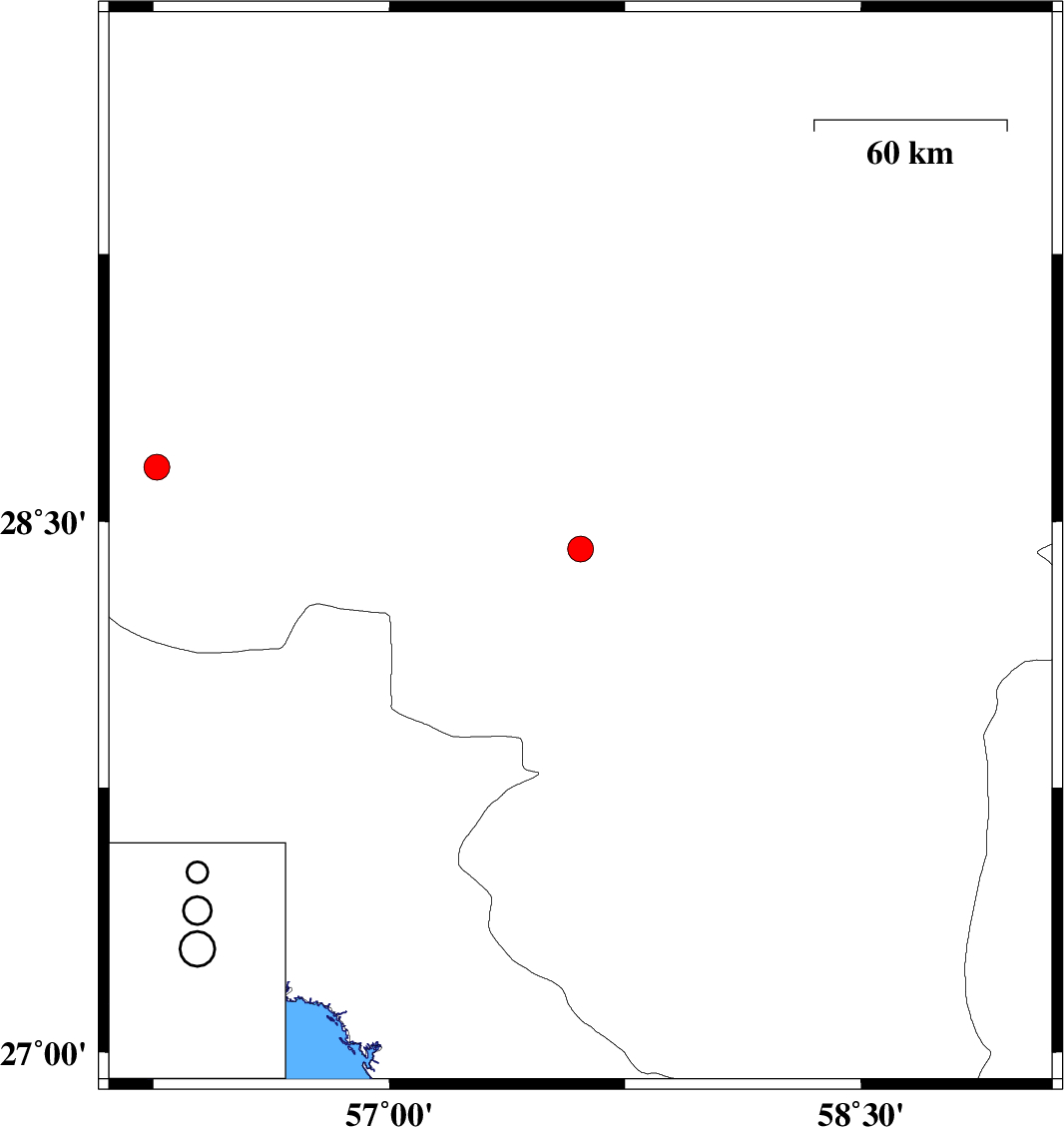 2022/10/23 | 13:00:29.9 | 16:30:29.9 | 28.424 | 57.608 | 12 | ML:3.7 | Kerman Province, 30 km South-West of Jiroft | ||