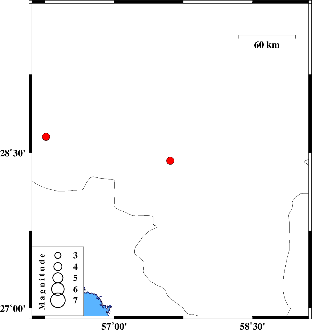 | 2022/10/23 | 13:00:29.9 | 16:30:29.9 | 28.424 | 57.608 | 12 | ML:3.7 | Kerman Province, 30 km South-West of Jiroft | ||