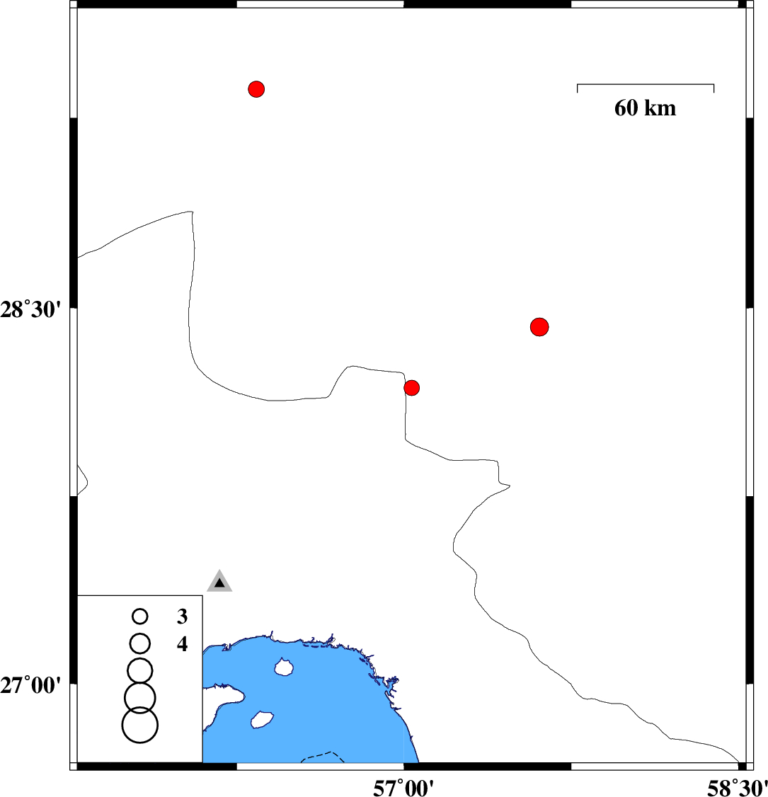 | 2022/10/25 | 19:47:45.7 | 23:17:45.7 | 28.182 | 57.034 | 12 | ML:3.1 | Kerman Province, 70 km North-West of Kahnuj | ||