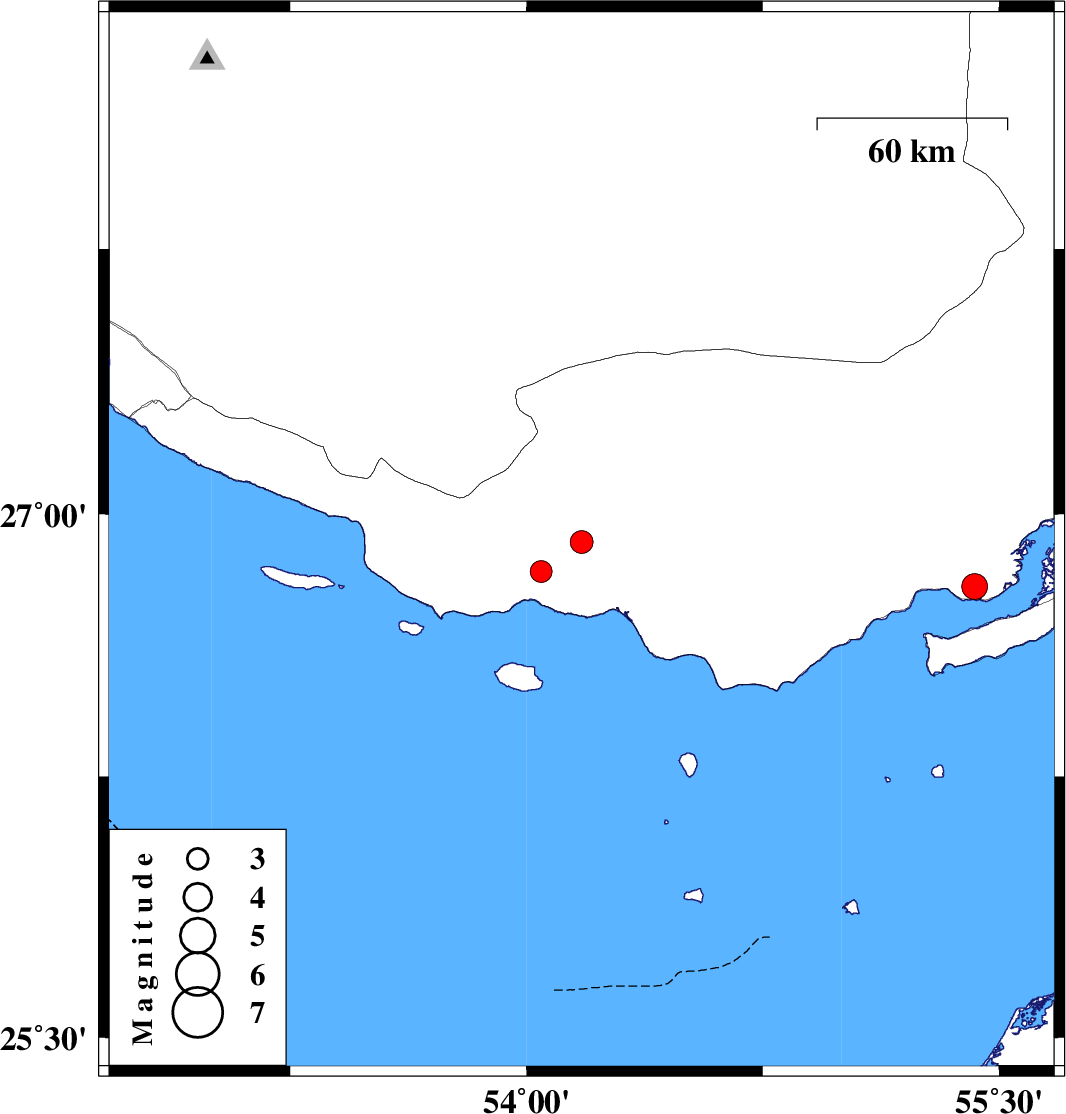 | 2022/10/26 | 14:22:56.7 | 17:52:56.7 | 26.92 | 54.175 | 12 | ML:3.2 | Hormozgan Province, 36 km South-West of Bastak | ||
