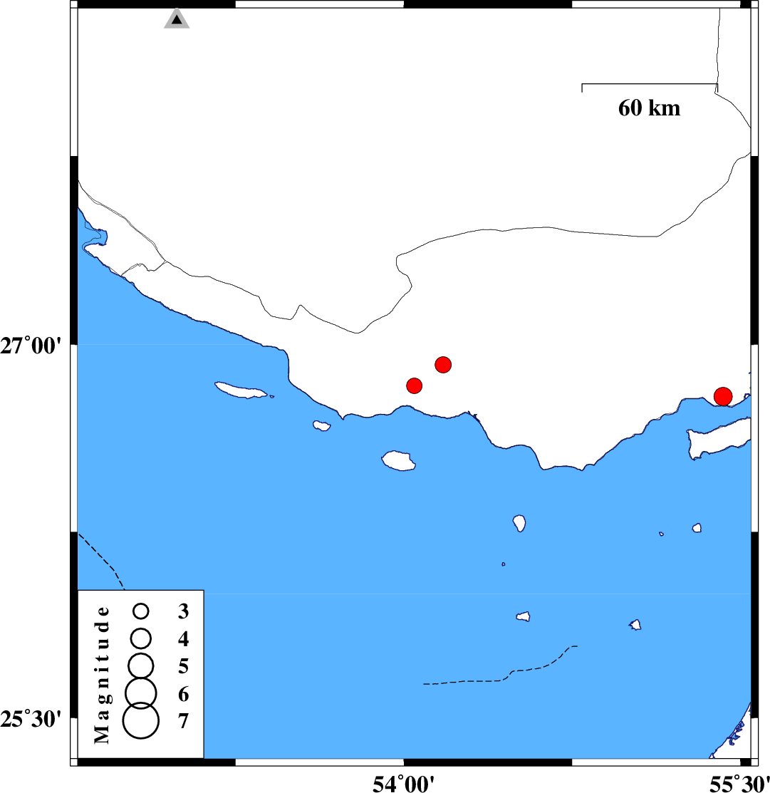 | 2022/10/24 | 11:21:08.8 | 14:51:08.8 | 26.793 | 55.423 | 12 | ML:3.6 | Hormozgan Province, 64 km North-East of Bandar-e lengeh |
