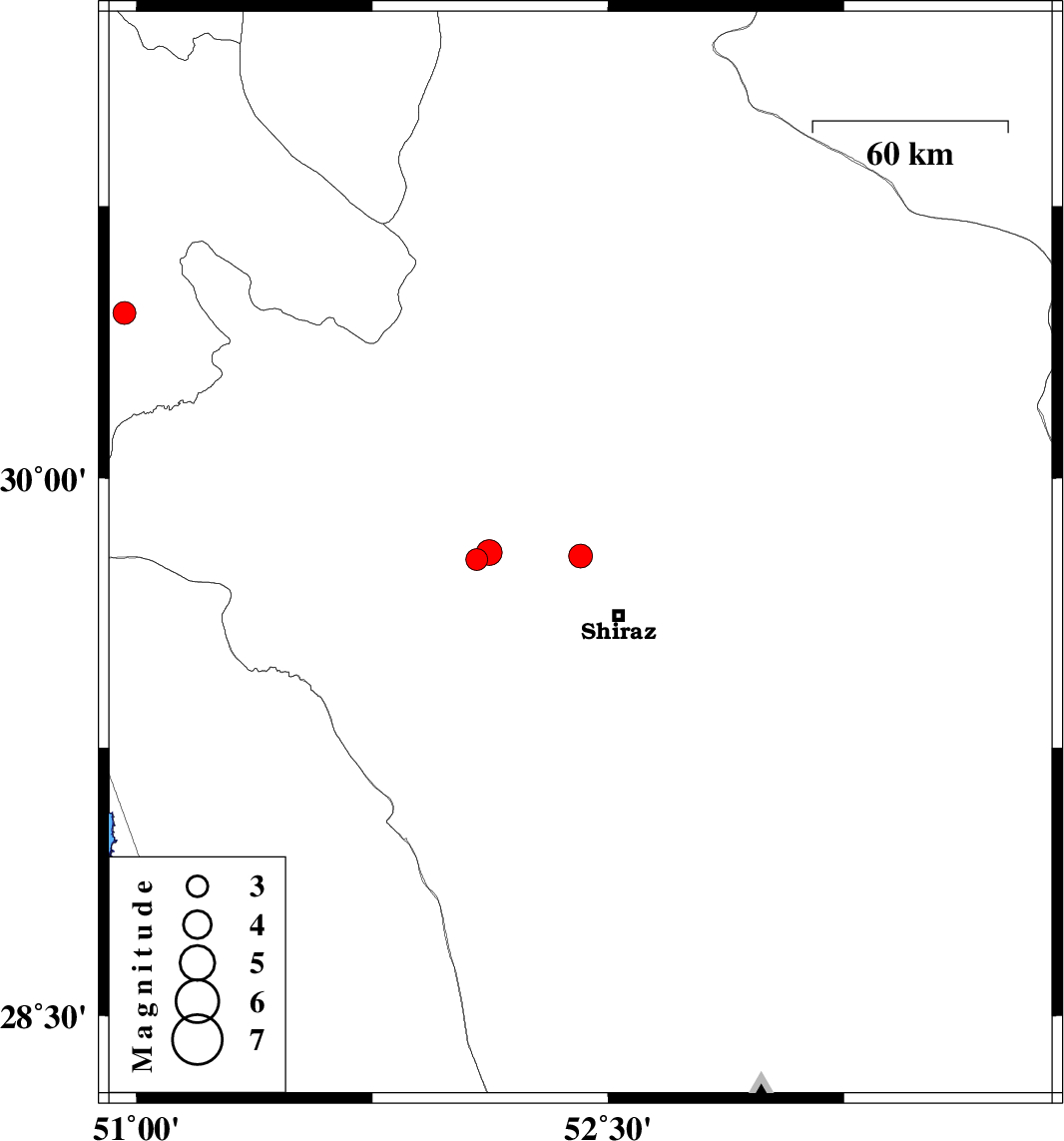 | 2022/10/31 | 01:12:28.6 | 04:42:28.6 | 29.784 | 52.412 | 16 | ML:3.4 | Fars Province, 22 km North-West of Shiraz | ||