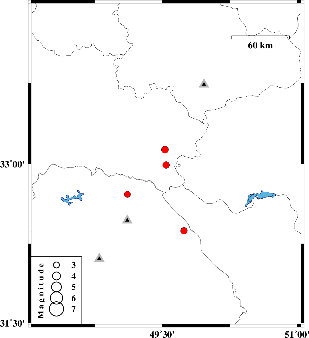 | 2022/11/03 | 04:49:35.7 | 08:19:35.7 | 32.989 | 49.544 | 12 | ML:3.4 | Lorestan Province, 52 km South of Azna | ||