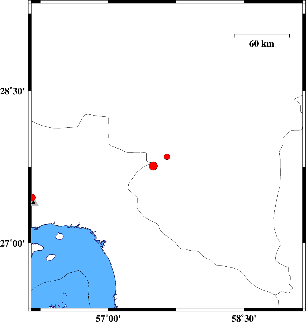 2022/11/03 | 03:28:32.3 | 06:58:32.3 | 27.851 | 57.649 | 12 | ML:3 | Kerman Province, 12 km of Kahnuj | ||