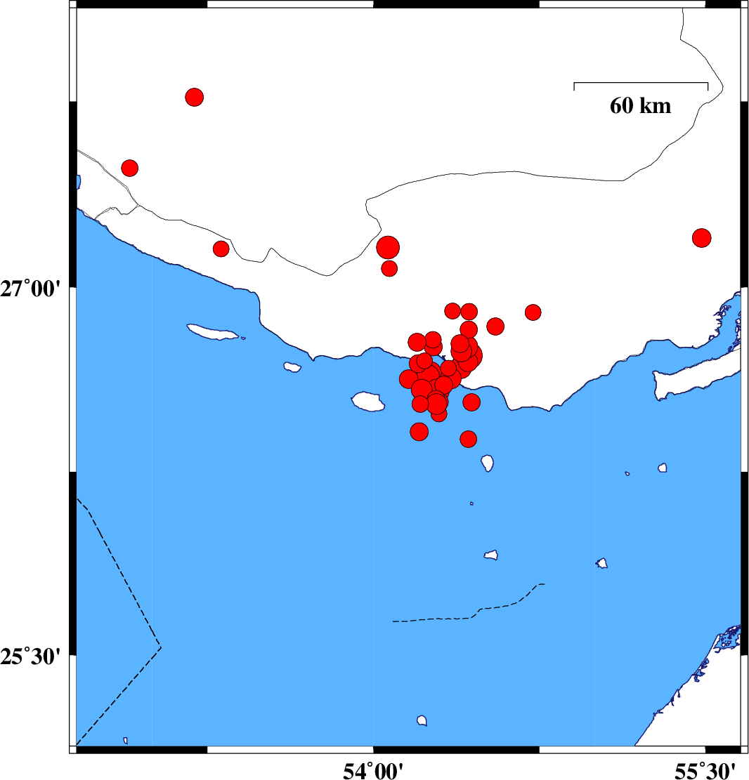2022/06/15 19:53:54.8 00:23:54.8 26.68954.20212 ML:3.6 Persian Gulf, 59 km South-West of Bastak
