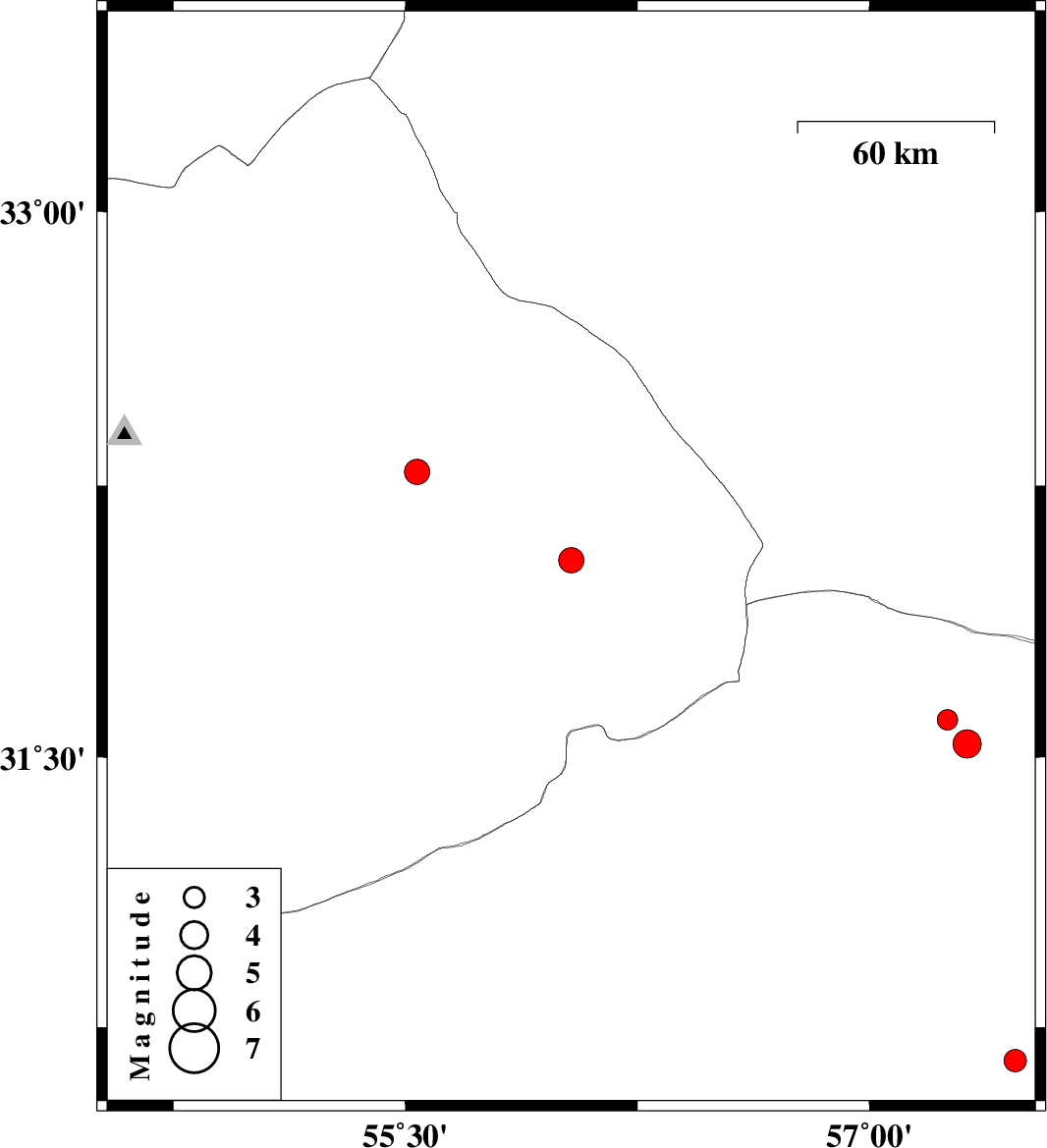 | 2022/11/25 | 09:39:22.1 | 13:09:22.1 | 31.604 | 57.252 | 12 | ML:3 | Kerman Province, 56 km North-East of Ravar | ||