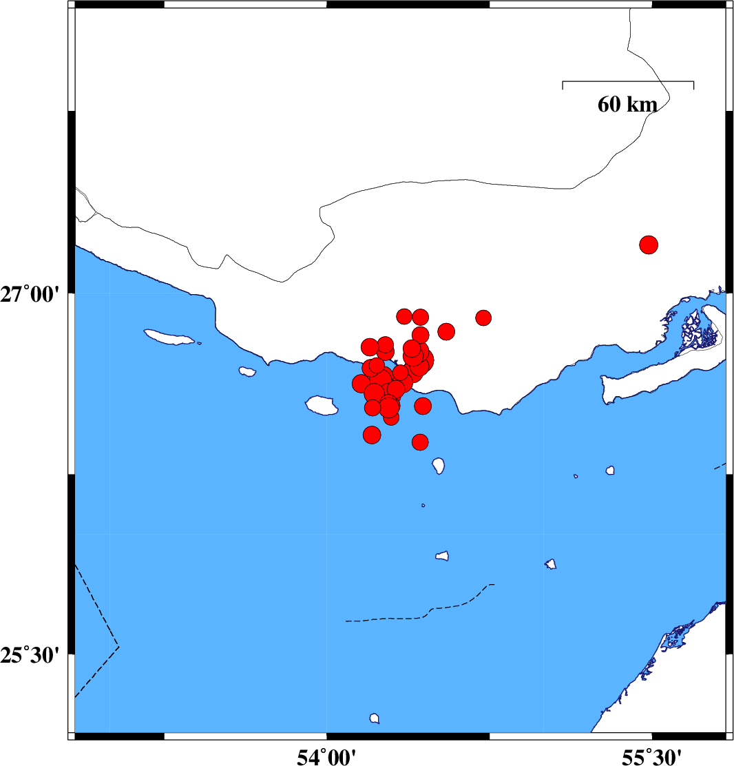 2022/06/15 19:53:54.8 00:23:54.8 26.68954.20212 ML:3.6 Persian Gulf, 59 km South-West of Bastak