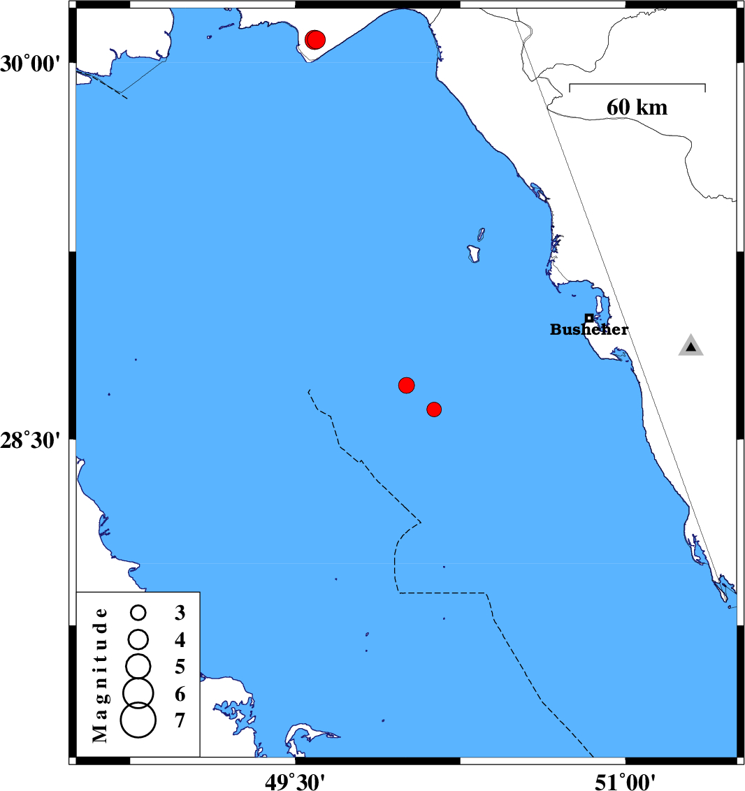 | 2023/03/06 | 15:07:48.4 | 18:37:48.4 | 28.716 | 50.005 | 12 | ML:3.2 | Persian Gulf, 86 km South-West of Busheher | ||