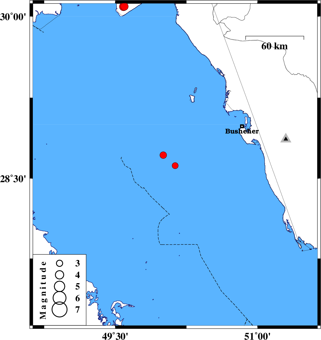 | 2023/03/06 | 15:07:48.4 | 18:37:48.4 | 28.716 | 50.005 | 12 | ML:3.2 | Persian Gulf, 86 km South-West of Busheher | ||