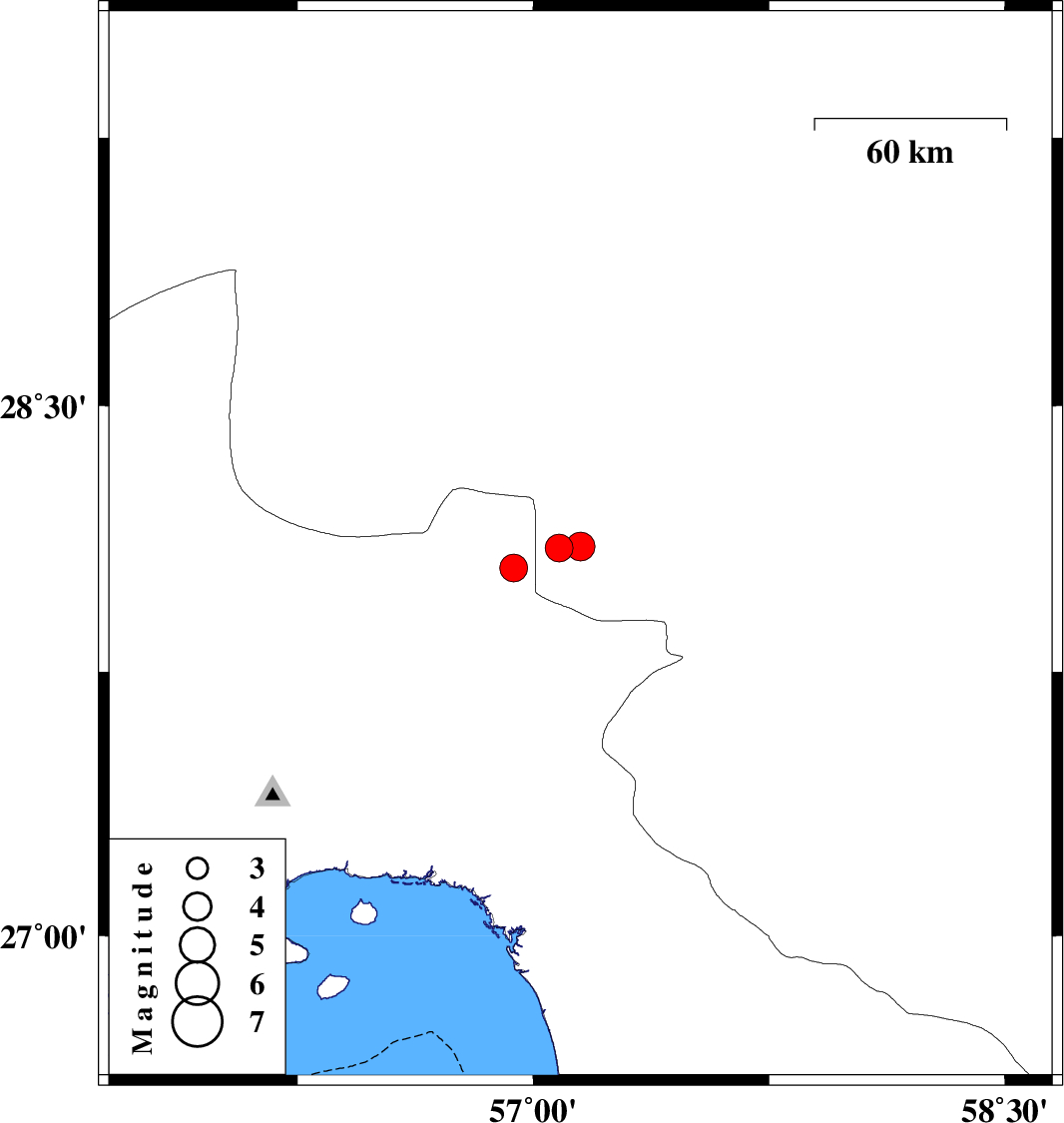 | 2023/04/03 | 03:55:05.0 | 07:25:05.0 | 28.043 | 56.938 | 12 | ML:4 | Hormozgan Province, 75 km -West of Kahnuj |