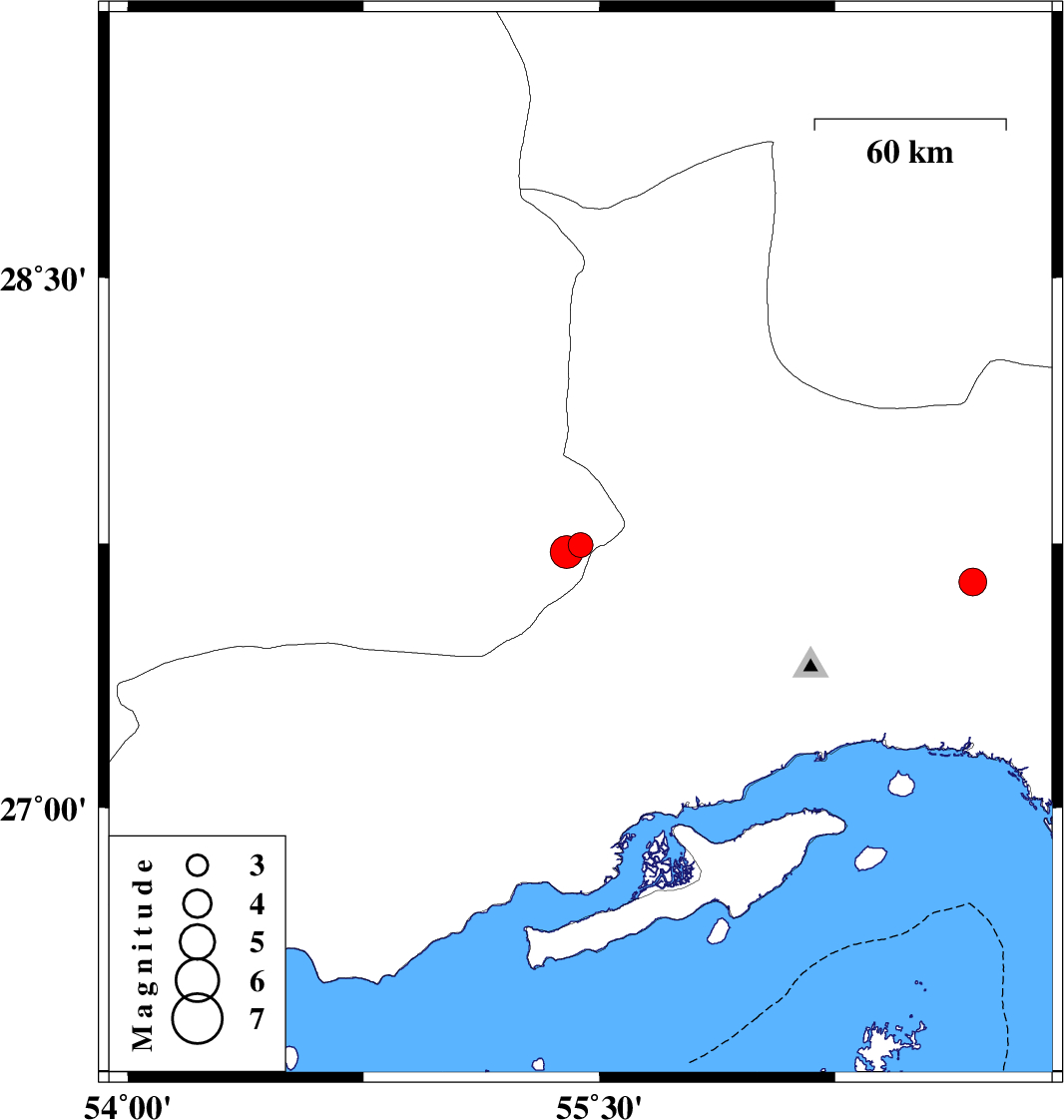 | 2023/04/27 | 10:20:48.8 | 13:50:48.8 | 27.726 | 55.396 | 10 | ML:4.6 | Fars Province, 82 km South-West of Hajiabad |