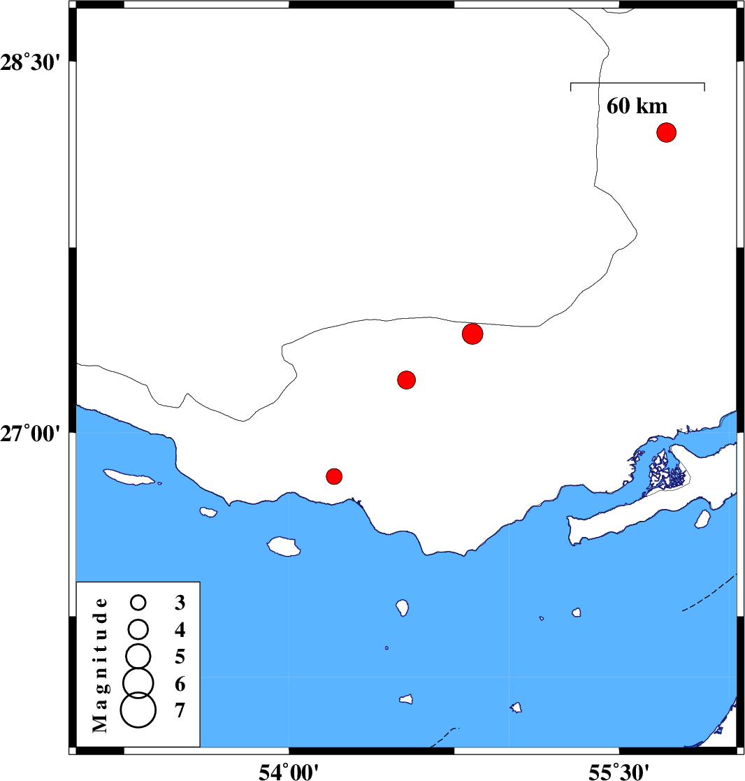 2023/06/22 | 12:05:08.3 | 15:35:08.3 | 26.821 | 54.205 | 12 | ML:3.3 | Hormozgan Province, 45 km South-West of Bastak | ||