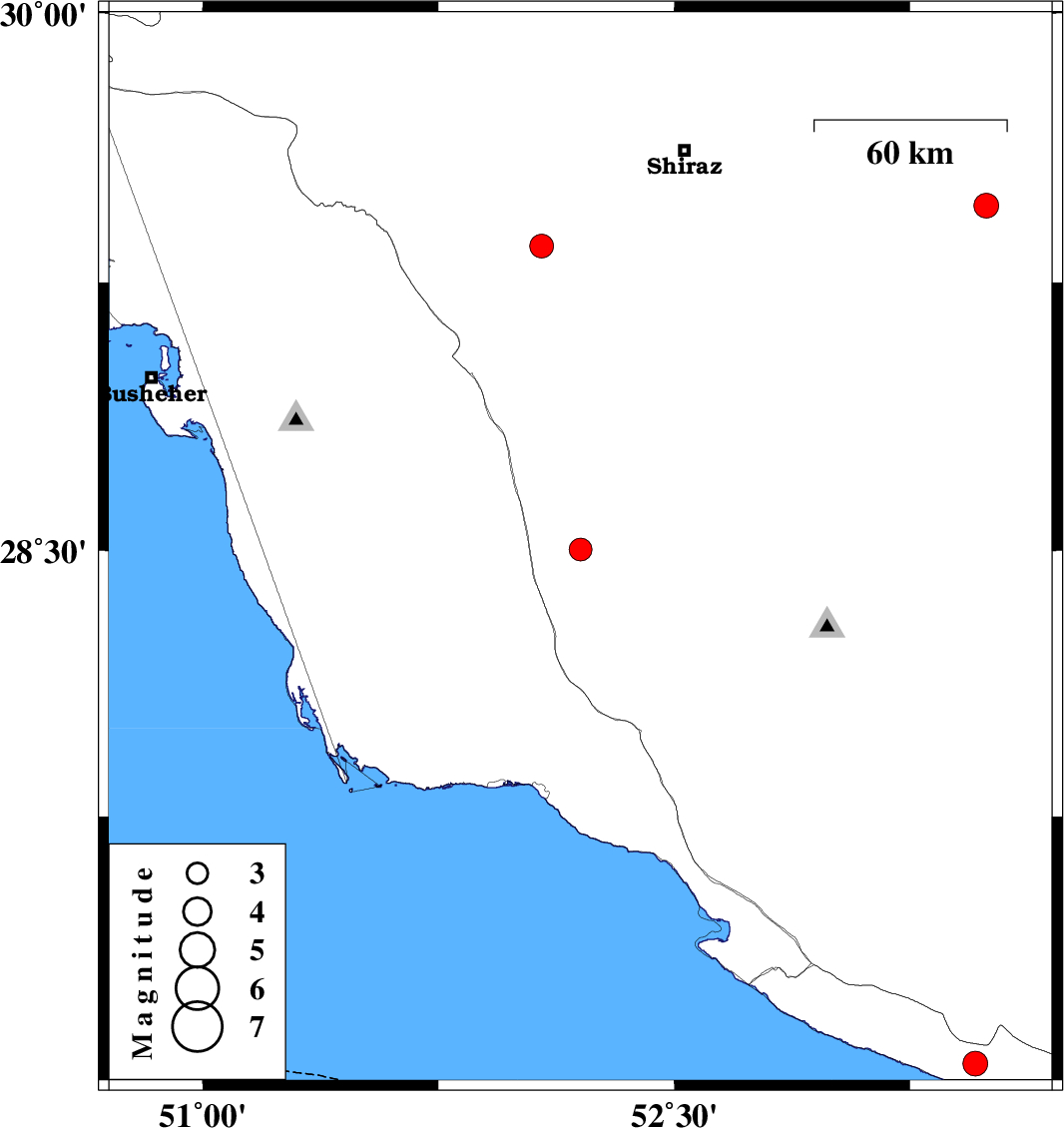 2023/07/29 | 08:32:40.1 | 12:02:40.1 | 28.503 | 52.202 | 12 | ML:3.2 | Fars Province, 42 km South-East of Farashband | ||