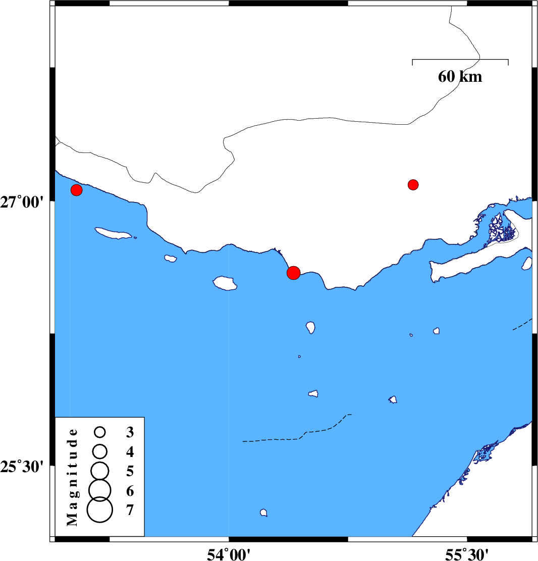 2023/09/27 | 10:58:54.8 | 14:28:54.8 | 27.061 | 53.042 | 9 | ML:3.3 | Persian Gulf, 33 km South-West of Lamerd | ||