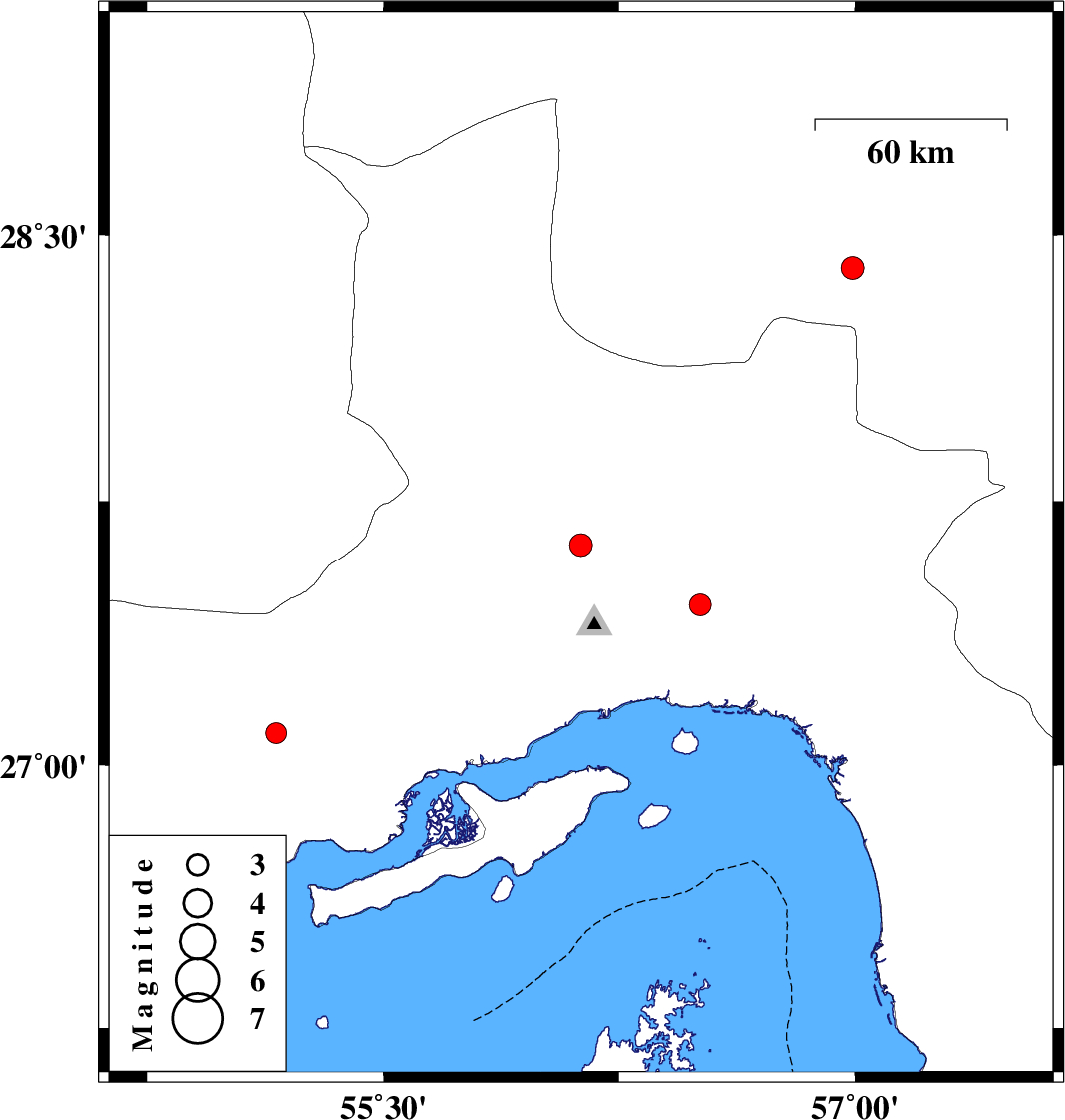 2023/10/02 | 19:46:54.3 | 23:16:54.3 | 27.625 | 56.129 | 8 | ML:3.3 | Hormozgan Province, 51 km North-West of Bandar-e abbas | ||