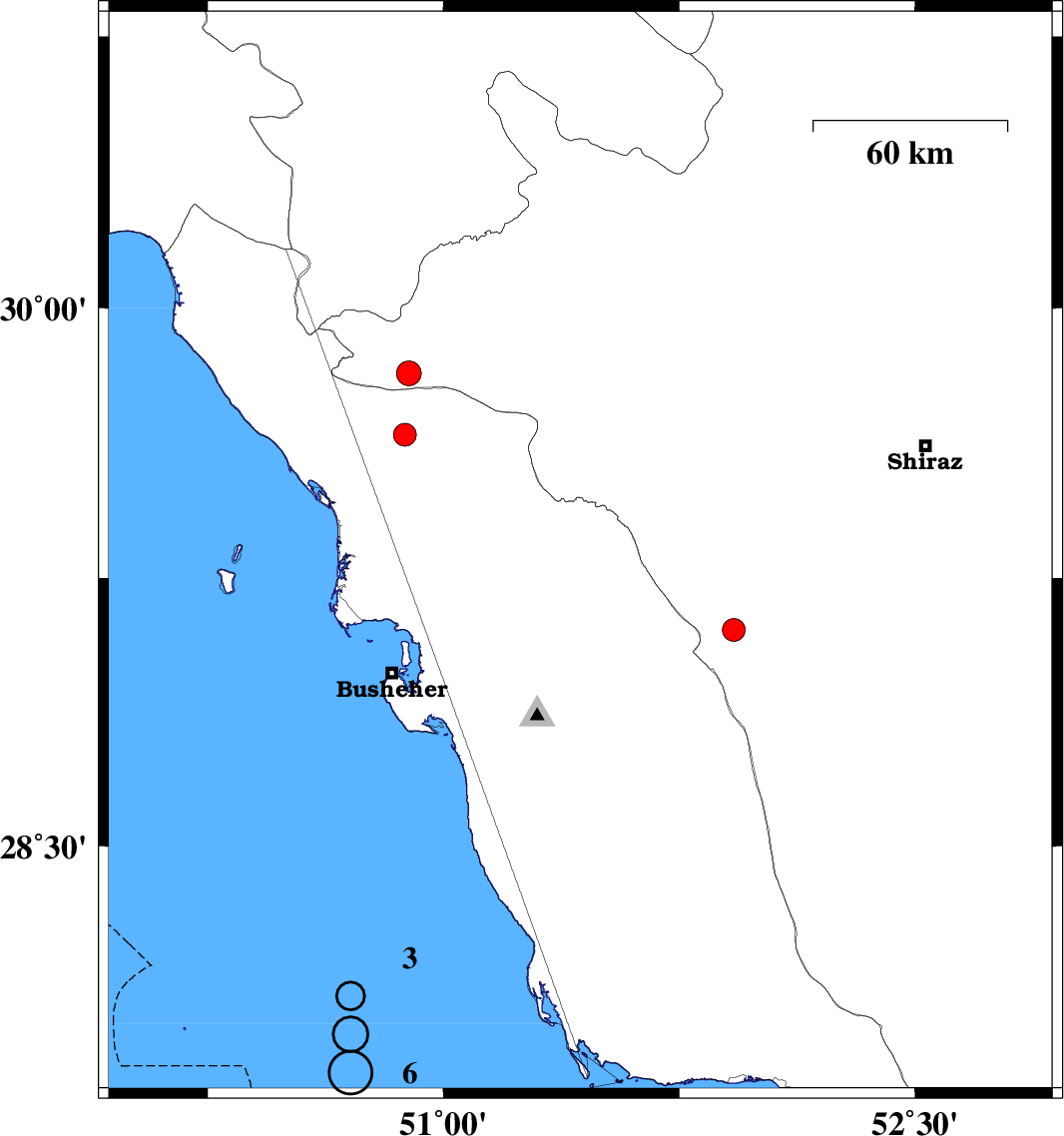 2023/10/10 | 13:58:41.9 | 17:28:41.9 | 29.319 | 51.436 | 12 | ML:3.2 | Bushehr Province, 23 km -East of Borazjan | ||