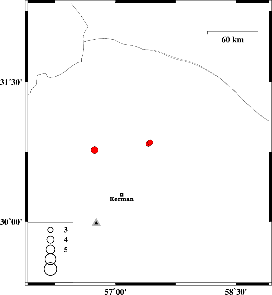 2023/10/16 | 02:08:25.4 | 05:38:25.4 | 30.837 | 57.41 | 12 | ML:3 | Kerman Province, 80 km -East of Zarand | ||