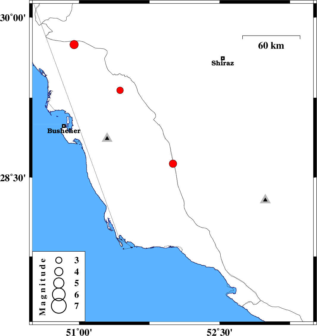 2023/10/10 | 13:58:41.9 | 17:28:41.9 | 29.319 | 51.436 | 12 | ML:3.2 | Bushehr Province, 23 km -East of Borazjan | ||