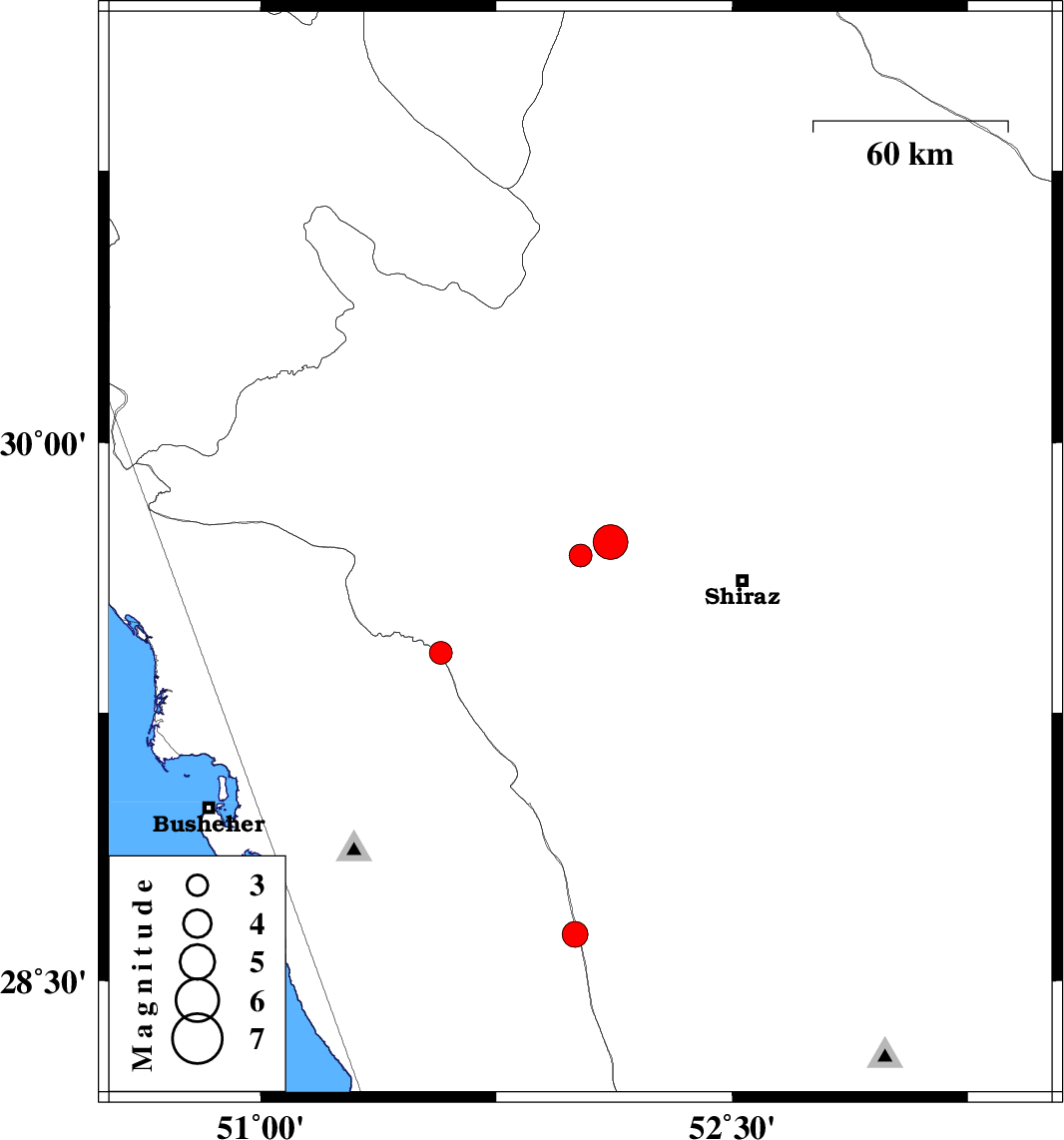 2023/10/16 | 13:56:11.9 | 17:26:11.9 | 28.63 | 52.001 | 16 | ML:3.6 | Bushehr Province, 28 km South of Farashband |