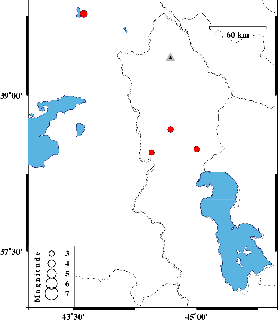 | 2021/03/12 | 05:57:02.0 | 09:27:02.0 | 39.77 | 43.627 | 12 | ML:4 | Turkey, 88 km South-West of Yerevan | ||