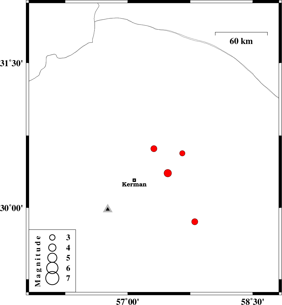 2023/12/23 | 16:37:57.9 | 20:07:57.9 | 30.567 | 57.655 | 10 | ML:3 | Kerman Province, 63 km North-East of Kerman |