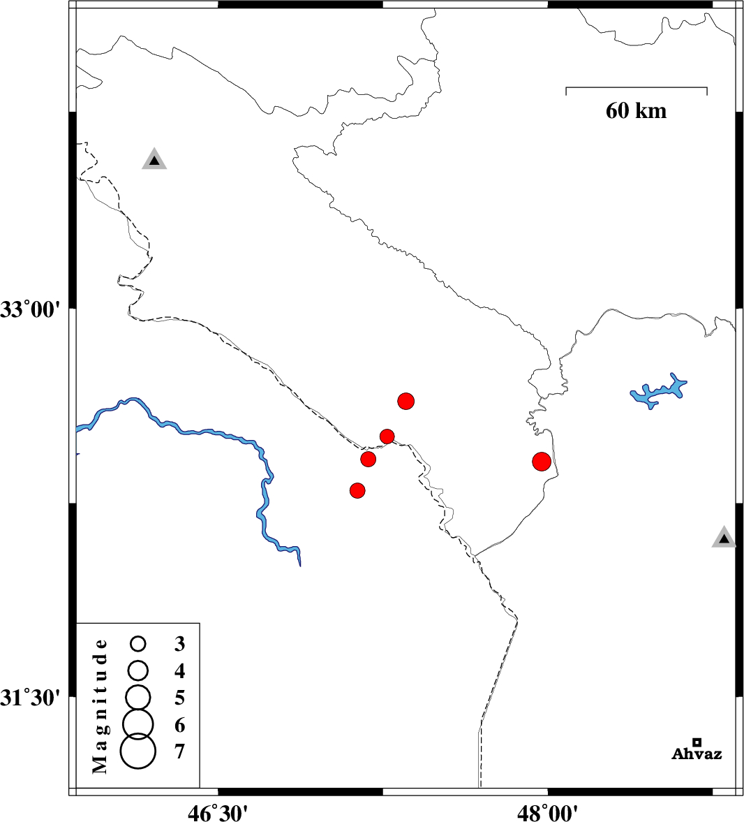 | 2021/03/08 | 03:24:19.0 | 06:54:19.0 | 32.42 | 47.182 | 19 | ML:3.1 | Iraq, 31 km South of Dehloran | ||
