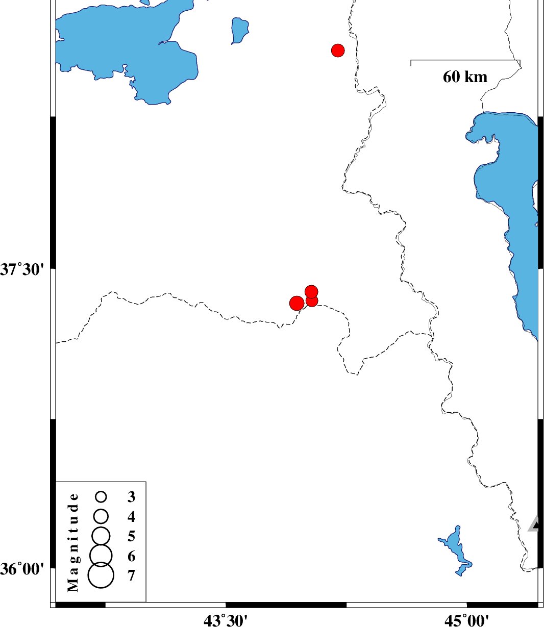 | 2024/01/06 | 17:25:56.7 | 20:55:56.7 | 37.388 | 44.032 | 12 | ML:3.2 | Turkey, 93 km South-West of Orumiyeh |