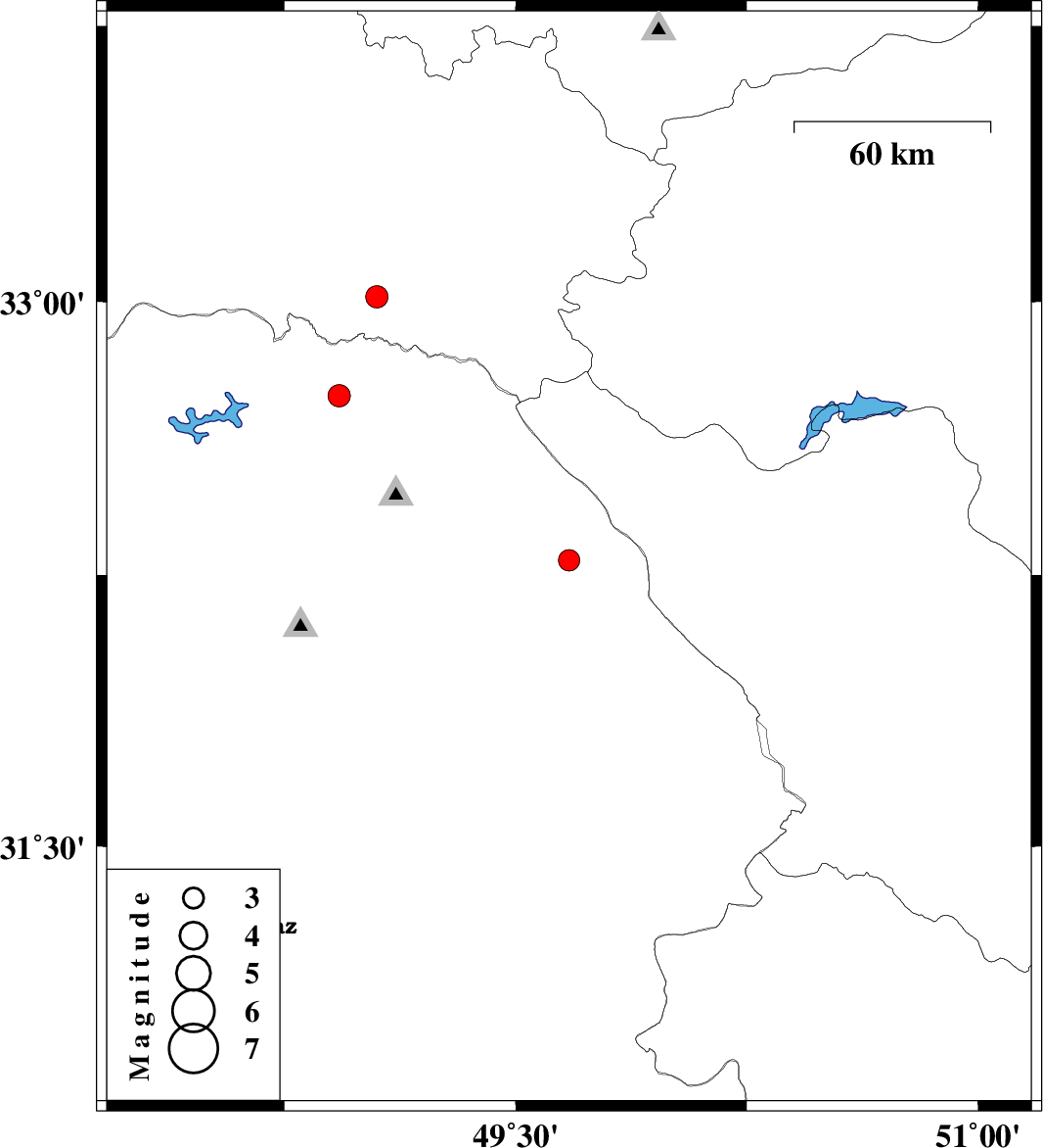 | 2024/02/08 | 07:54:28.2 | 11:24:28.2 | 32.291 | 49.673 | 12 | ML:3.1 | Khoozestan Province, 46 km South-West of Chelgard | ||