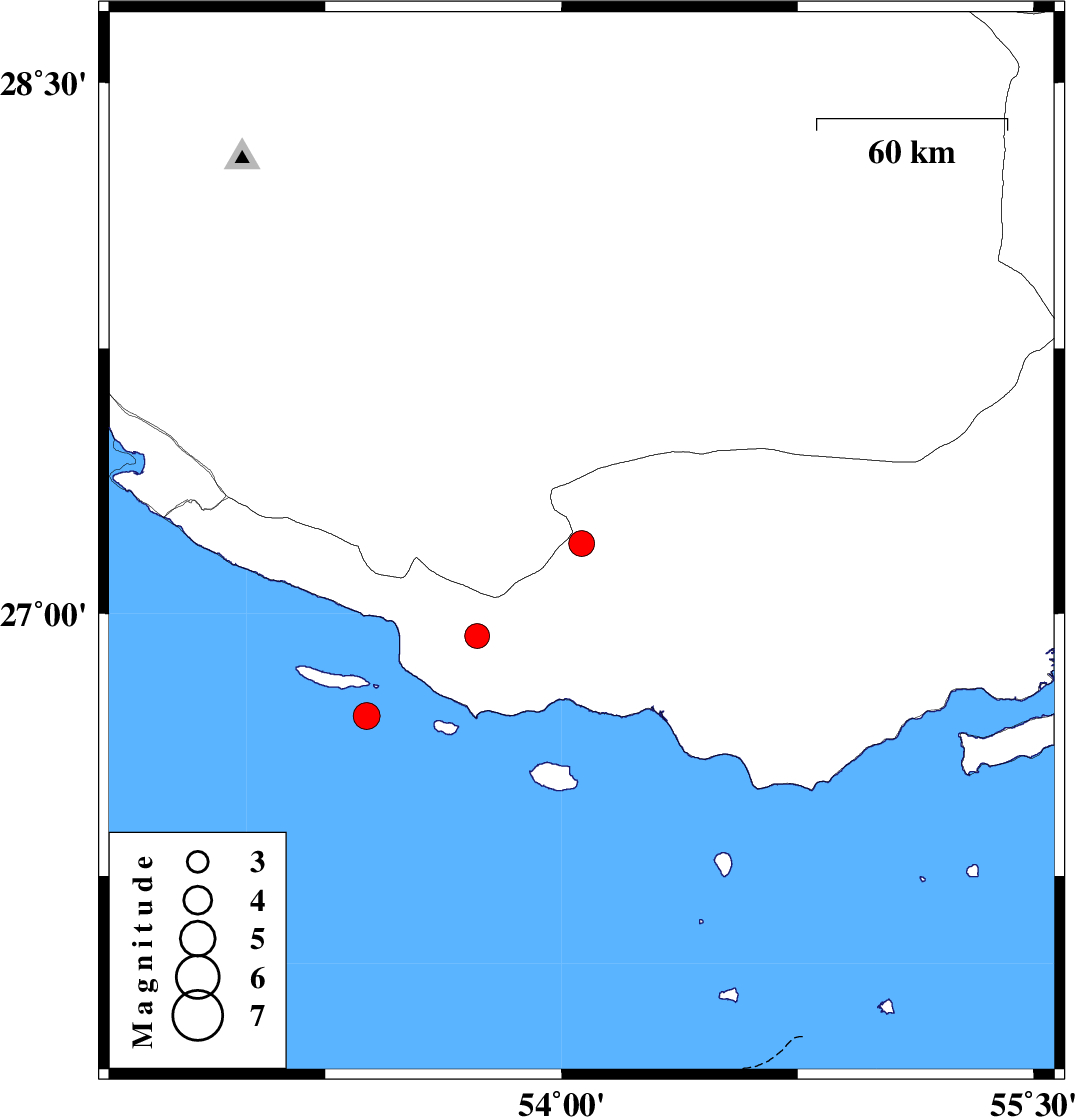 | 2024/03/06 | 15:46:49.0 | 19:16:49.0 | 26.707 | 53.382 | 12 | ML:3.8 | Persian Gulf, 73 km South-East of Lamerd | ||