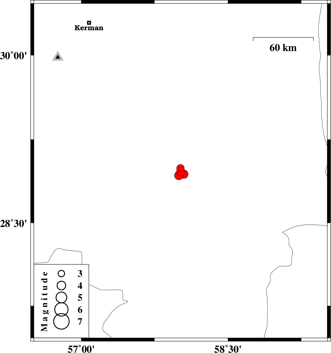 | 2024/03/07 | 17:27:03.9 | 20:57:03.9 | 28.939 | 58.05 | 8 | ML:3.9 | Kerman Province, 35 km South-West of Bam |